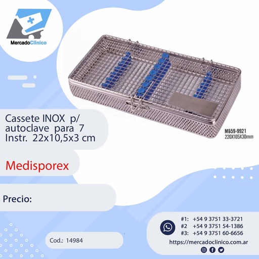 Cassette inoxidable para autoclave Medidas: 220 x 105 x 30 mm PARA 7 INSTRUMENTOS Marca: MEDISPOREX
